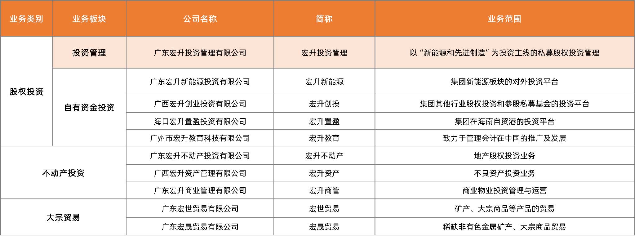 广东宏升投资集团有限公司(简称“宏升投资集团”或“集团”)注册地为广州市越秀区,注册资本人民币1亿元。集团凭借着有深度、高素养的多元化投资团队主要着力于股权投资、不动产投资(包括:地产股权投资、不良资产投资、商业管理三个方向的投资)、大宗贸易三大业务板块。旗下控股和管理的主要公司包括: